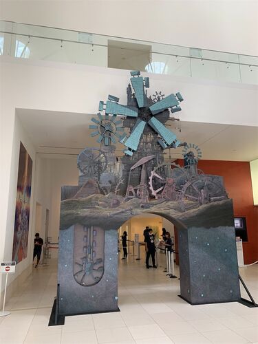今日はようやく、県立博物館・美術館で開催中のジブリ展に行ってきました!平日で大人ばかりでしたが、それでも多かったです。 入口付近で撮った写真です。ラピュタのOPのシーンの順番で並べてみました。最後にゴンドアにいるシータと牛が風車の側に立ってる…