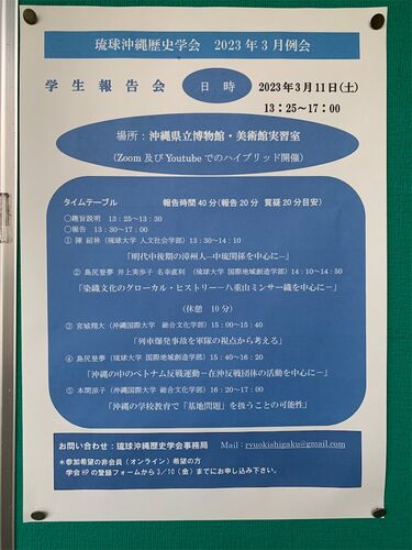 先日の11日は、琉球沖縄歴史学会の学生報告会でした。3年ぶりの対面復活でした。5本の報告が並び、うちのゼミ生も登壇の機会をいただきました。こだわって一つのことを懸命に掘り下げる研究報告はやっぱり聞くのが楽しかったです!どれもとても良かったです。…